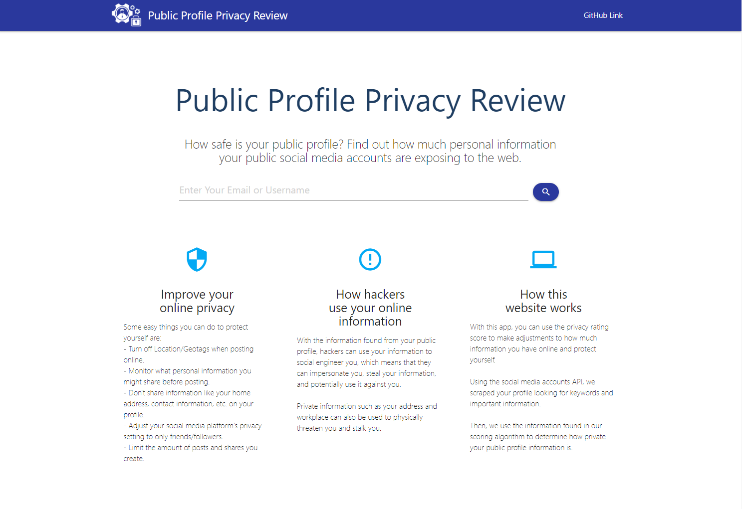 Public Profile Privacy Review is a web application that analyzes the privacy and security of a public social media account.