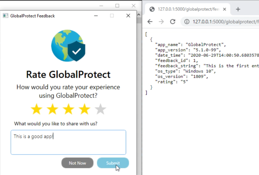 GlobalProtect desktop app users can submit feedback through the user client window made in WPF in C#. The feedback is initialized by calling the API, which is made with Flask in Python, and storing the information submitted from the user.
