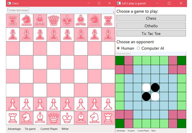 Each game is fully playable against a computer AI. The AI is implemented using the Minimax with Alpha Beta Algorithm. The game calculates the advantage that the winning player has each turn and the player is allowed